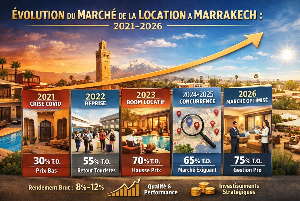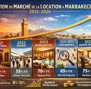 Entre 2021 et 2026, le marché de la location courte durée à Marrakech a connu une transformation structurelle. Post-pandémie, explosion de la demande, professionnalisation et montée en gamme : le secteur est désormais mature et concurrentiel. Cet article propose une analyse chiffrée et stratégique destinée aux investisseurs souhaitant optimiser leur rendement locatif.